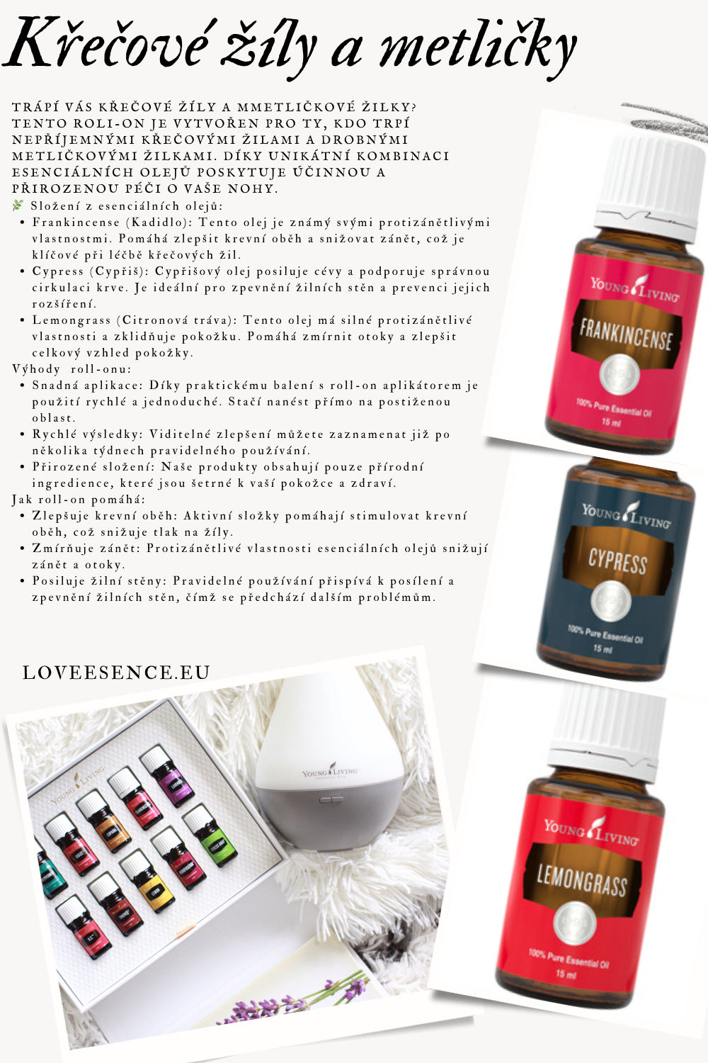 tento roli-on je vytvořen pro ty, kdo trpí nepříjemnými křečovými žilami a drobnými metličkovými žilkami. Díky unikátní kombinaci esenciálních olejů poskytuje účinnou a přirozenou péči o vaše nohy.